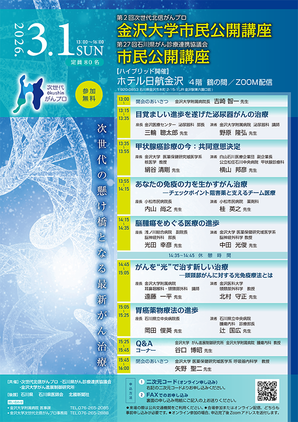 2026/3/1開催 第2回 次世代北信がんプロ 金沢大学市民公開講座 ・第27回 石川県がん診療連携協議会 市民公開講座